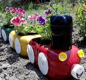Няколко пластмасови туби, боядисани в различни цветове и декорирани с помощта на капачки и други подръчни материали, могат да разнообразят външния вид на градината Ви, като същевременно с това да привлекат вниманието на децата с формата на влакче.
