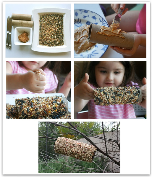 За целта трябва да си набавите ролка от домакинска или тоалетна хартия, фъстъчено (бадемово) масло и храна за птици (слънчогледови и други семена). Разнесете маслото по ролката и след това посипете със семената. Закачете хранилката на близък клон и съвсем скоро първите малки, гладни душици ще дойдат, за да получат своя обяд. За децата е истинско удоволствие да наблюдават това и да усетят удовлетворението от труда си.